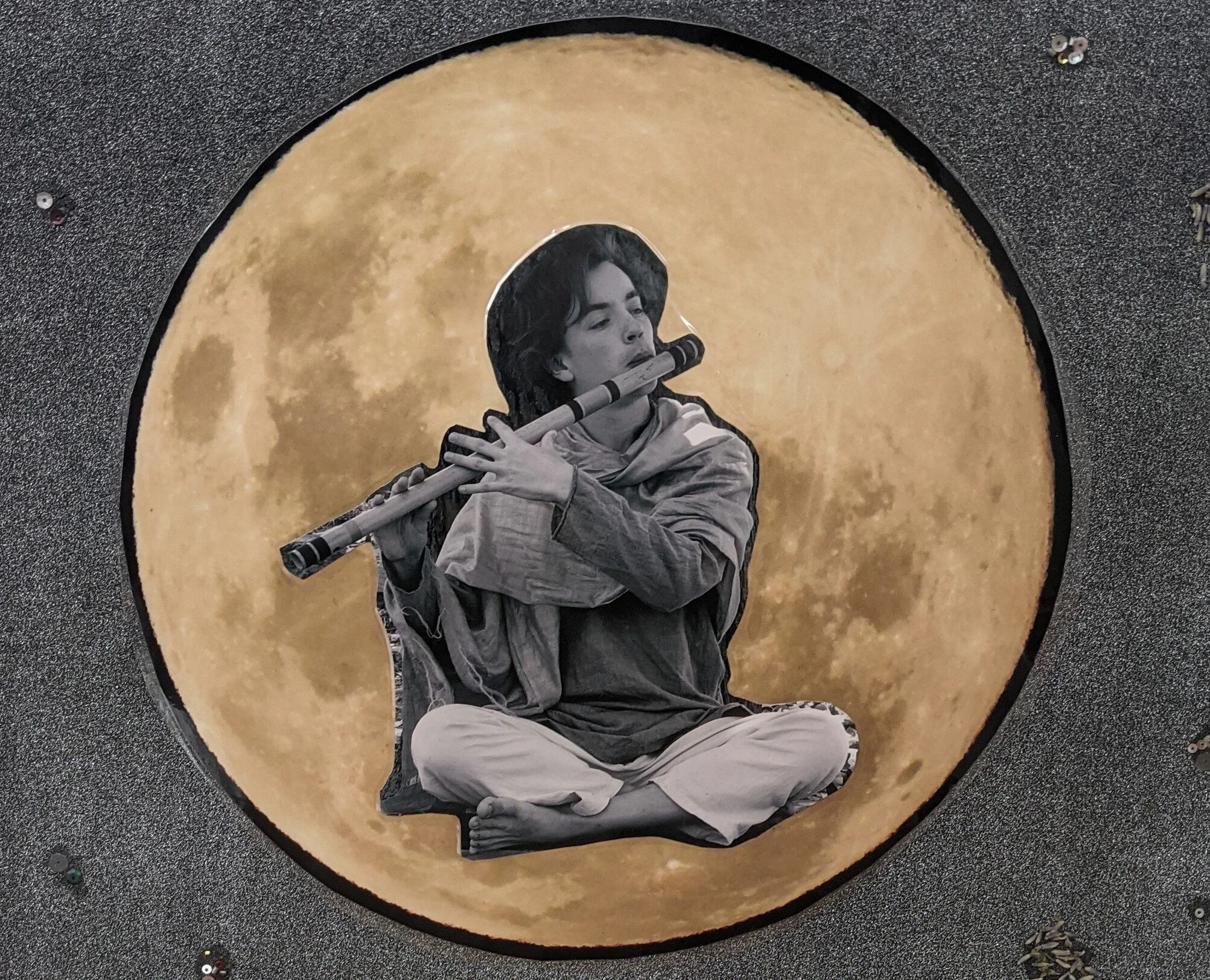 Ahmisa Paramo Dharma - Nikolai playing his flute on top of a photograph of the full moon illuminating the ashram.
